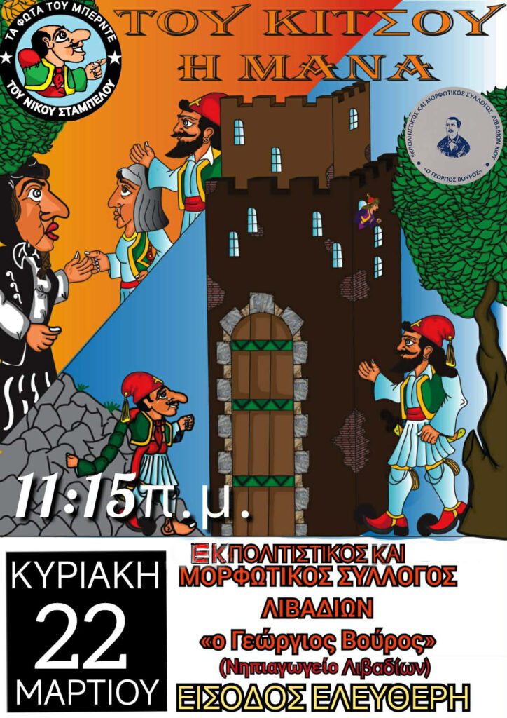 Ο Εκπολιτιστικός και Μορφωτικός Σύλλογος Λιβαδίων Χίου «Ο ΓΕΩΡΓΙΟΣ ΒΟΥΡΟΣ» σας προσκαλεί στην επετειακή παράσταση θεάτρου σκιών  «ΤΟΥ ΚΙΤΣΟΥ Η ΜΑΝΑ»,  την Κυριακή 22 Μαρτίου 2026, και ώρα 11:15 π.μ. στην αίθουσά του, (Παναγιώτη Αντωνοπούλου 6, όροφος Νηπιαγωγείου Λιβαδίων). Η παράσταση θα δοθεί από το θέατρο σκιών «ΤΑ ΦΩΤΑ ΤΟΥ ΜΠΕΡΝΤΕ» του ΝΙΚΟΥ ΣΤΑΜΠΕΛΟΥ.                                                                              ΕΙΣΟΔΟΣ ΕΛΕΥΘΕΡΗ